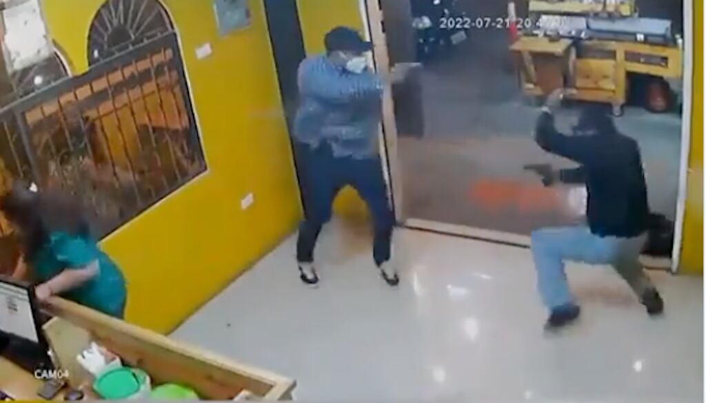 En las imágenes también se ve cómo el “héroe” del negocio también sufrió por los disparos que recibió, sin embargo, pudo mantenerse de pie. Finalmente, el sujeto que quería robar el negocio de comida comienza a desangrarse por la parte baja de su espalda.