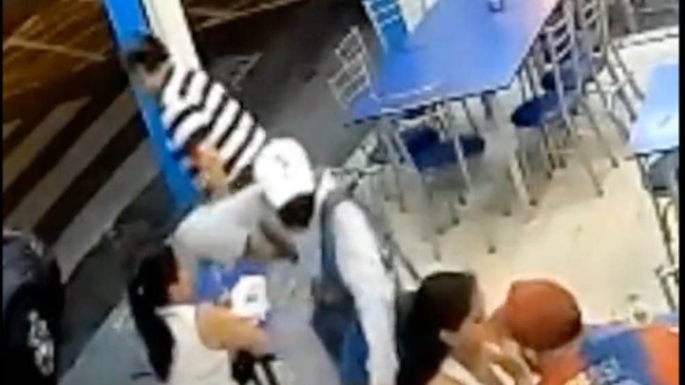 En las imágenes se puede apreciar que el hombre comparte mesa con una mujer, con quien platica de manera amena, pero, de repente, entra un sujeto de sudadera gris y gorra blanca, quien saca, de entre sus pertenencias, un arma de fuego y comienza a amagar a empleados y comensales para quitarles sus pertenencias.