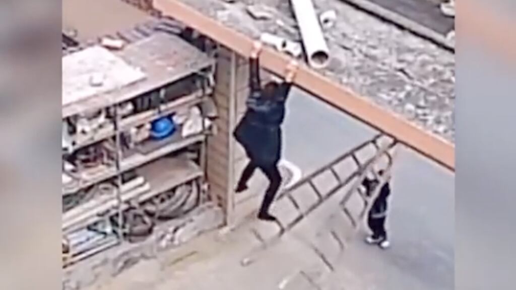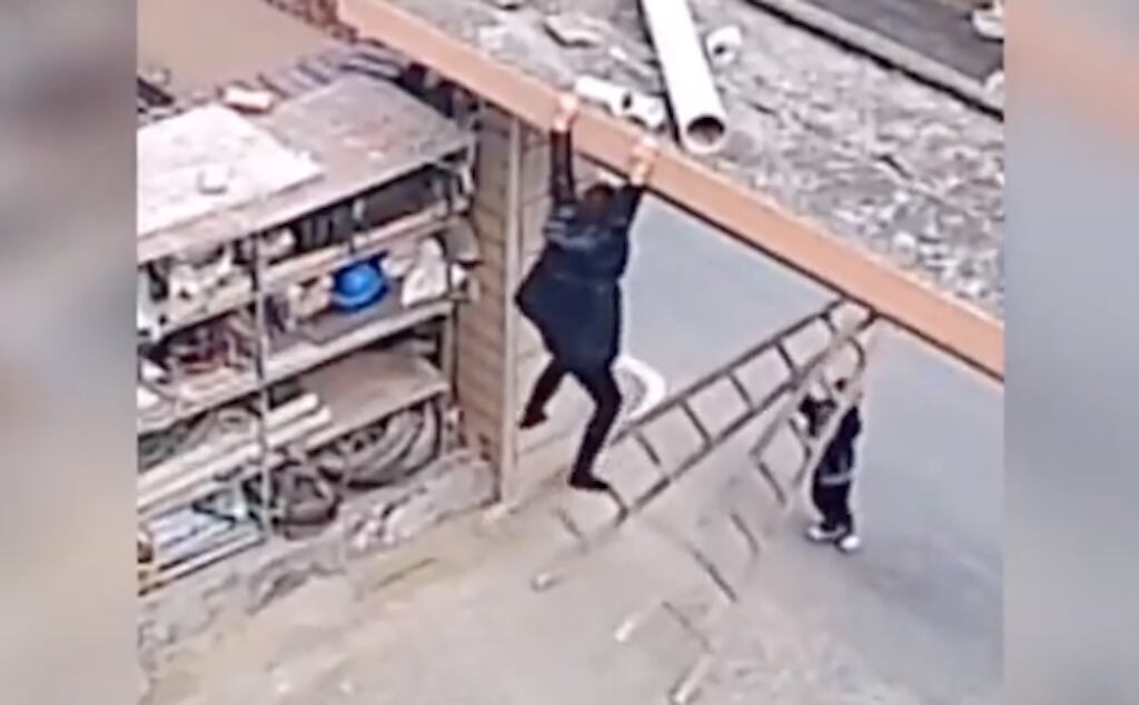Ocupando todas sus fuerzas, un niño levantó una escalera para acomodarla de nuevo y ayudar a una mujer, que sería su mamá, después de que se había quedado suspendida agarrándose con las manos de una estructura de la entrada de su casa.