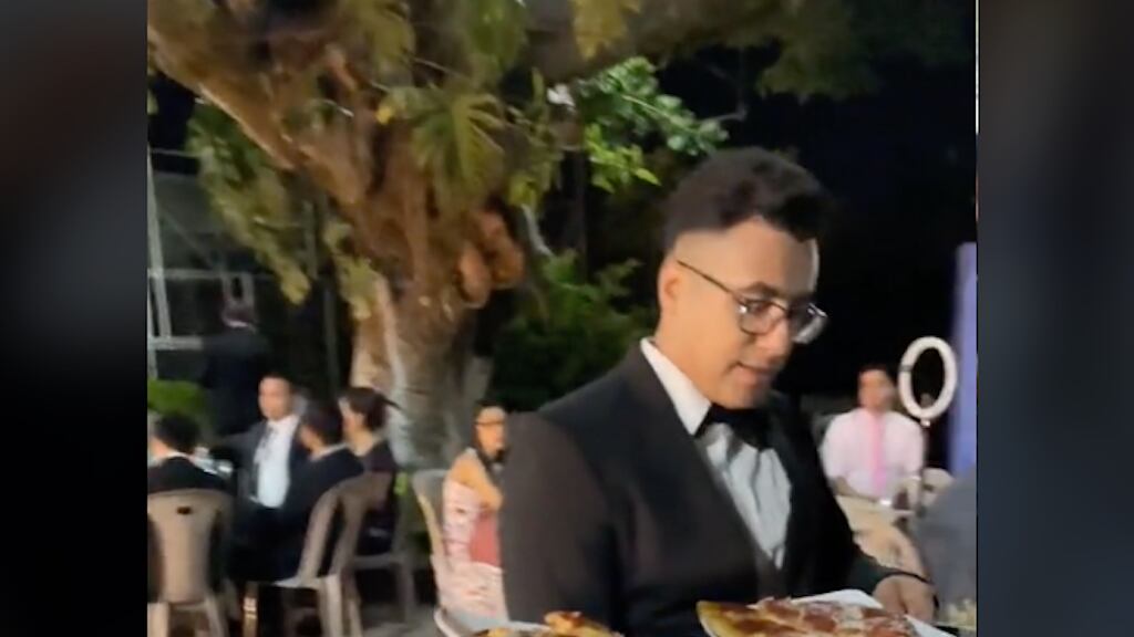 Para los novios, la solución para uno de los gastos fuertes el día de su matrimonio fue repartir pedazos de pizzas, parte de lo ocurrido fue captado en video y compartido en las redes sociales.