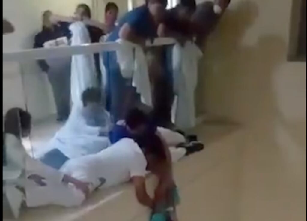 El video a 11 miembros del personal médico actuando para salvar a un hombre que pretende lanzarse al vacío. El paciente se encuentra suspendido en aire mientras cuatro doctores unen sus fuerzas para evitar que se caiga. En la grabación se observa cómo se resbala, sin embargo, en los dos pisos restantes se habían colocado colchonetas que le amortiguaron el golpe.