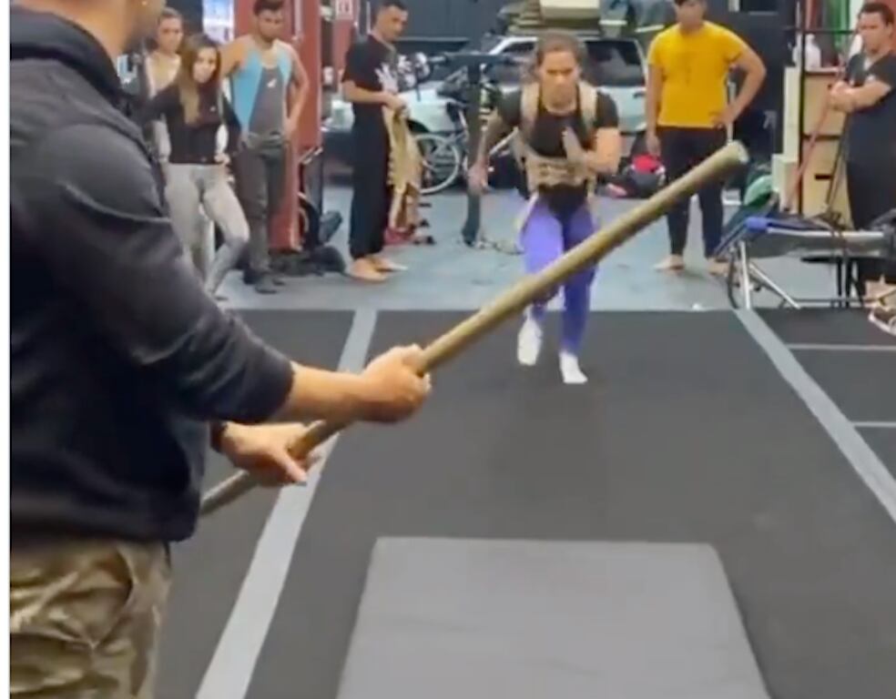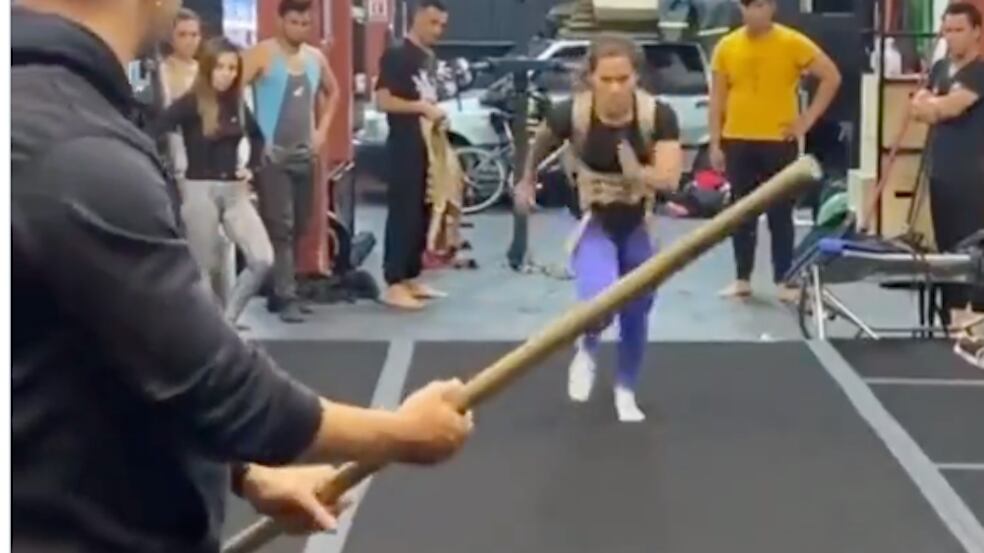 En el video, compartido por un usuario de Twitter, es posible observar el momento en que un hombre, quien porta una sudadera negra, sujeta un palo, con el que iba a realizar un acto. Solo unos segundos después, una mujer, quien es sostenida por un arnés y, además, porta una blusa negra y leggins morados, corre hacia el lugar en donde estaba el sujeto y es golpeada con el objeto; posteriormente queda tirada en una colchoneta.