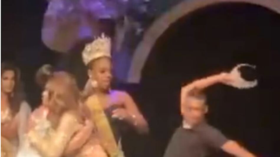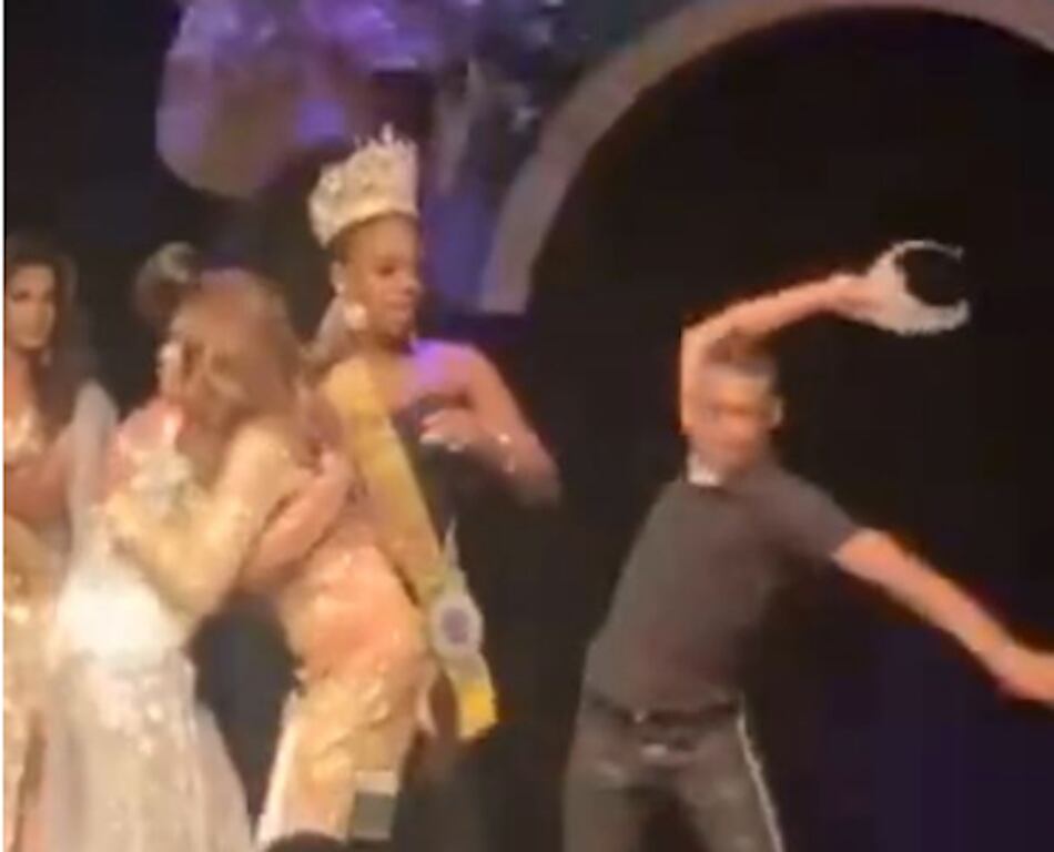 De forma inesperada, un hombre, que sería el esposo de una participante de un concurso de belleza y no estuvo de acuerdo con el resultado, arrebató la corona para romperla al azotarla en el piso.