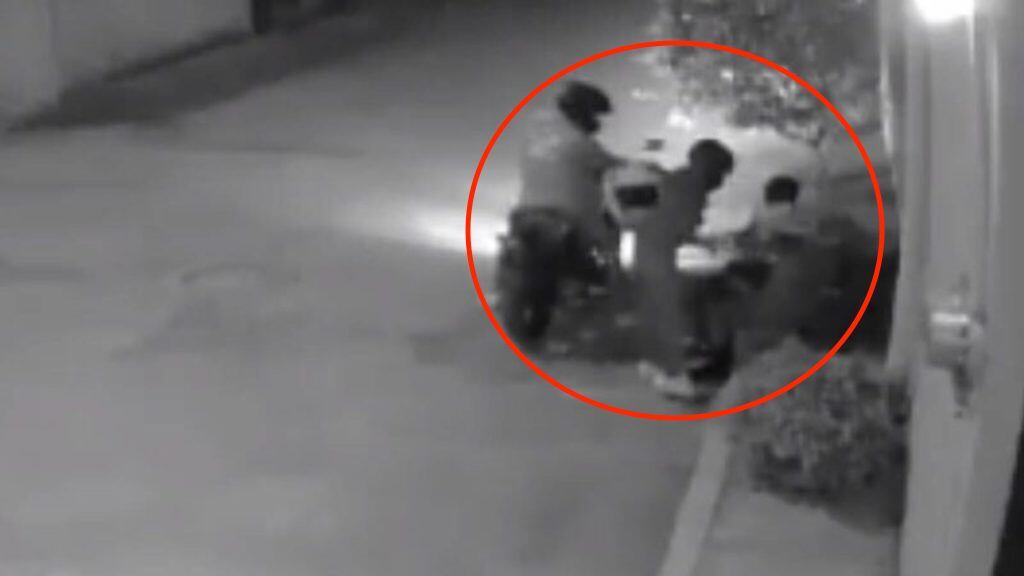En la grabación se puede observar cómo los asaltantes se desplazaban a bordo de una motocicleta, vistiendo uniformes similares a los de las empresas de entrega de comida a domicilio. Uno de ellos lleva la clásica mochila para guardar la mercadería en la espalda. Los atracadores, al ver a los jóvenes sentados en la banqueta, se frenan y comienzan el acto delincuencial.