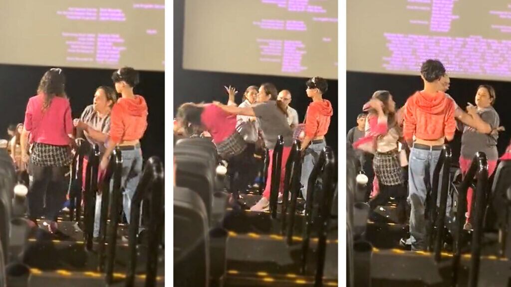 Solo unos instantes después, la persona, quien, al parecer, iba con su hija, sin decir una palabra, llega y empuja con fuerza a la joven, misma que cae en las butacas del cine. Incluso, un par de personas, al percatarse de la pelea, intentaron frenar a ambas mujeres, quienes se atacaron con golpes y empujones.