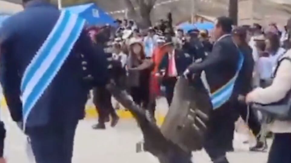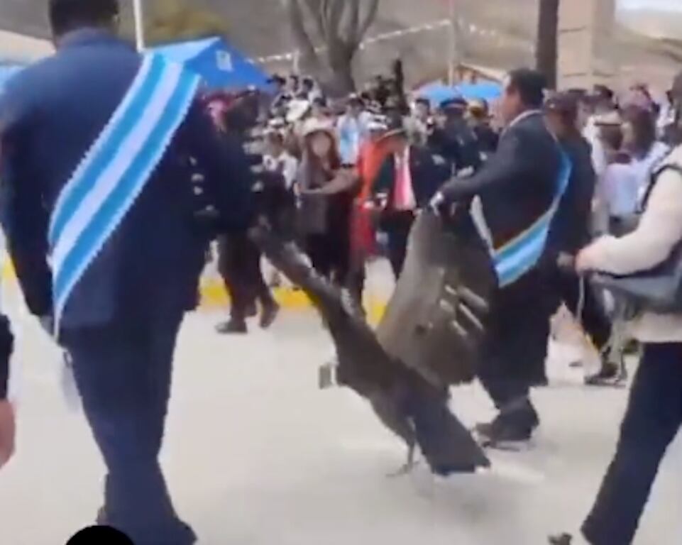 En el video, se puede apreciar claramente el delicado estado de salud del cóndor y cómo intenta liberarse una y otra vez. Sin embargo, algunos hombres lo sujetan por sus plumas, obligándolo a desfilar junto a ellos.