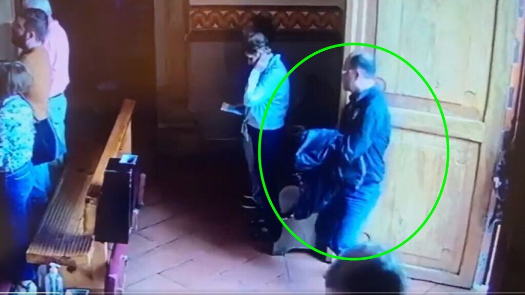 Con un movimiento rápido, pasa la bolsa a una cómplice que se encontraba afuera de la iglesia de San Isidro. Una vez que la toma, ambos se retiran rápidamente del lugar, mientras que nadie se dio cuenta del robo.