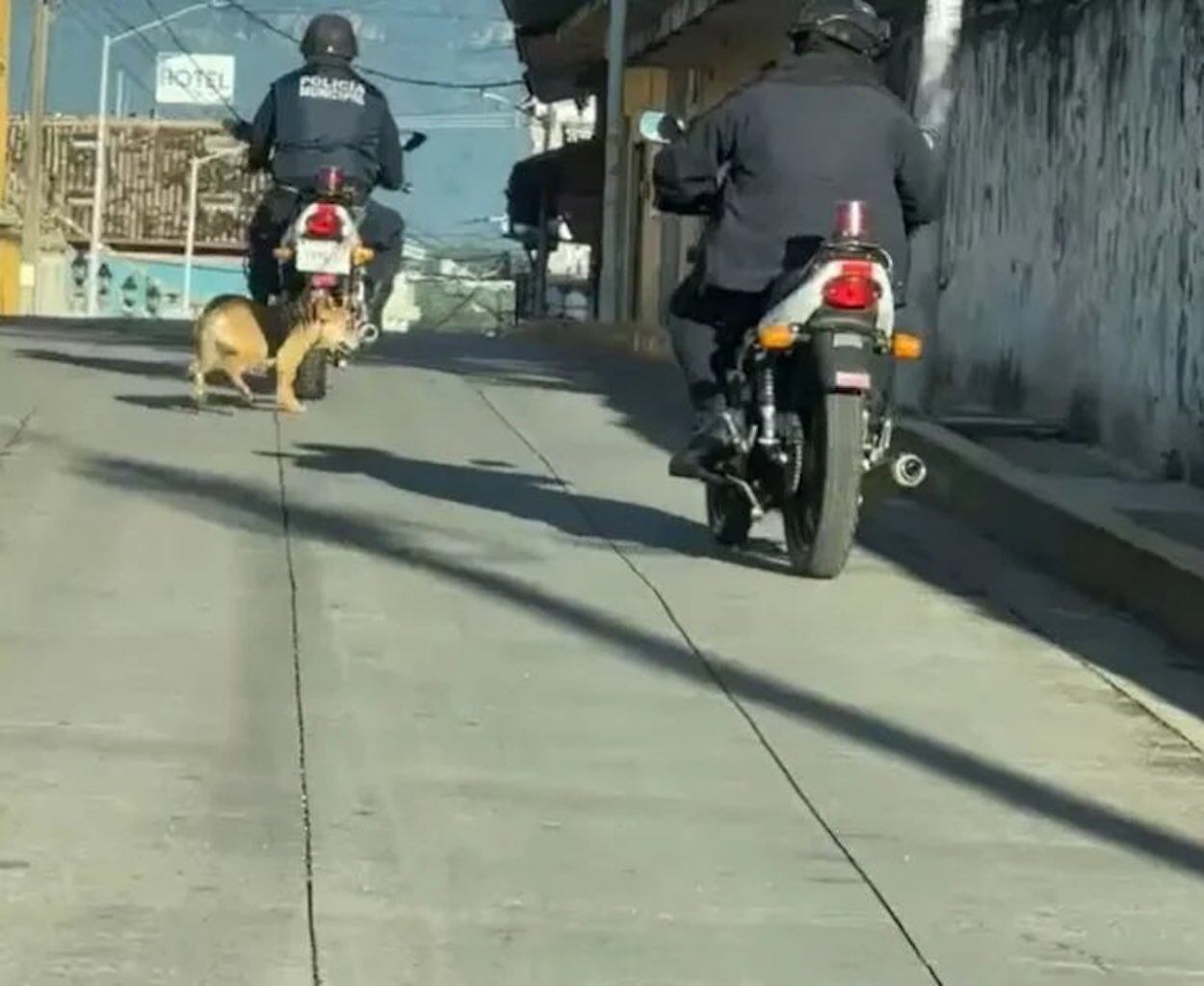 Las impactantes imágenes muestran a un individuo manejando una motocicleta mientras lleva atado al cuello a un perro que camina con dificultad. Detrás, otro agente de tránsito lo sigue en otra motocicleta, custodiándolo.