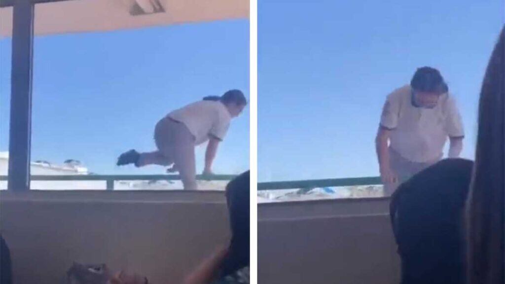 El video que compartió la página Despertar Minero, en Facebook, muestra a la alumna del Cobach 2 saltándose el barandal del segundo piso y dejándose caer. Mientras, sus compañeros la observan desde el interior de un salón.
