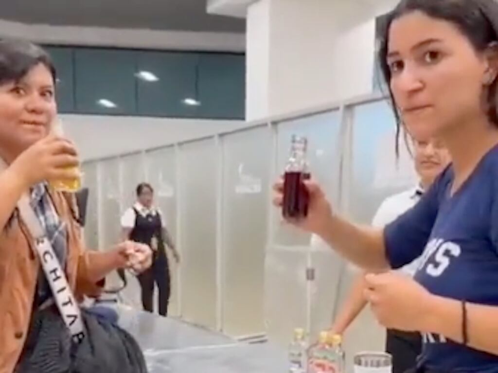 Las dos mujeres, con una actitud desenfadada, se enfrentaron a la decisión de tener que consumir su compra de licor antes de embarcar en su vuelo. Rodeadas de botellas, sonrientes y sin titubear, comenzaron a disfrutar de su inusual “degustación exprés” mientras eran filmadas por algún testigo entre risas y aplausos.