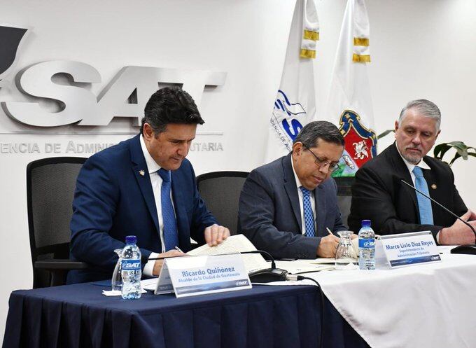 El superintendente Marco Livio Díaz y el alcalde de la ciudad de Guatemala, Ricardo Quiñónez, suscribieron un convenio de cooperación interinstitucional. Este permitirá el desarrollo de iniciativas conjuntas que promuevan una mejor recaudación, la cultura tributaria, seguridad y prevención vial, enfatizaron.