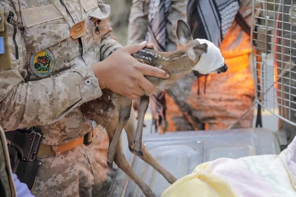 El venadito, de aproximadamente unos tres meses, presentaba quemaduras en el rostro y cuerpo debido al incendio forestal.