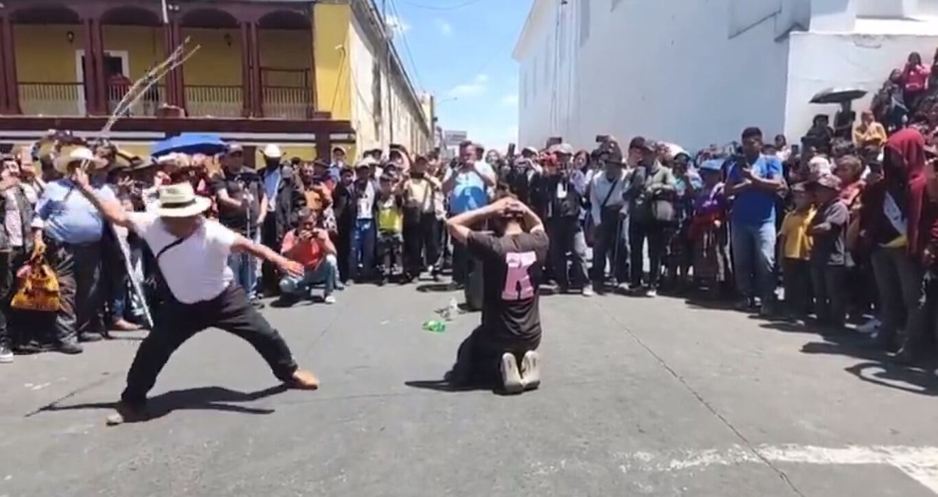 A vista de varias personas que documentan el suceso, el joven recibe varios latigazos en la espalda.
