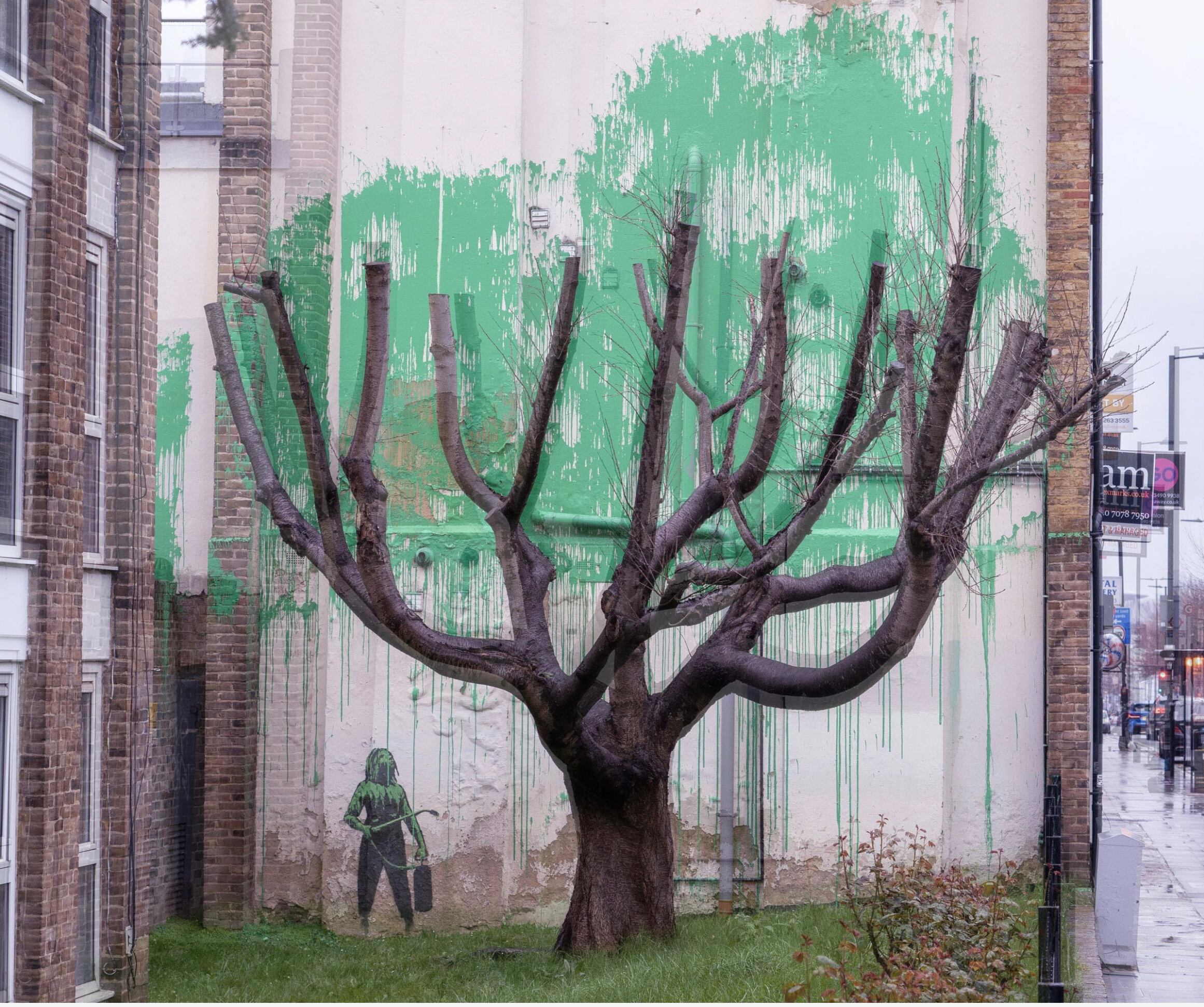 Recientemente, el barrio londinense de Finsbury Park se despertó con una sorpresa artística, pues el escurridizo artista Banksy creó un mural en el lateral de un edificio compuesto en su mayor parte por gotas de pintura verde hábilmente colocadas en la pared, interactúa con un árbol severamente podado en primer plano.