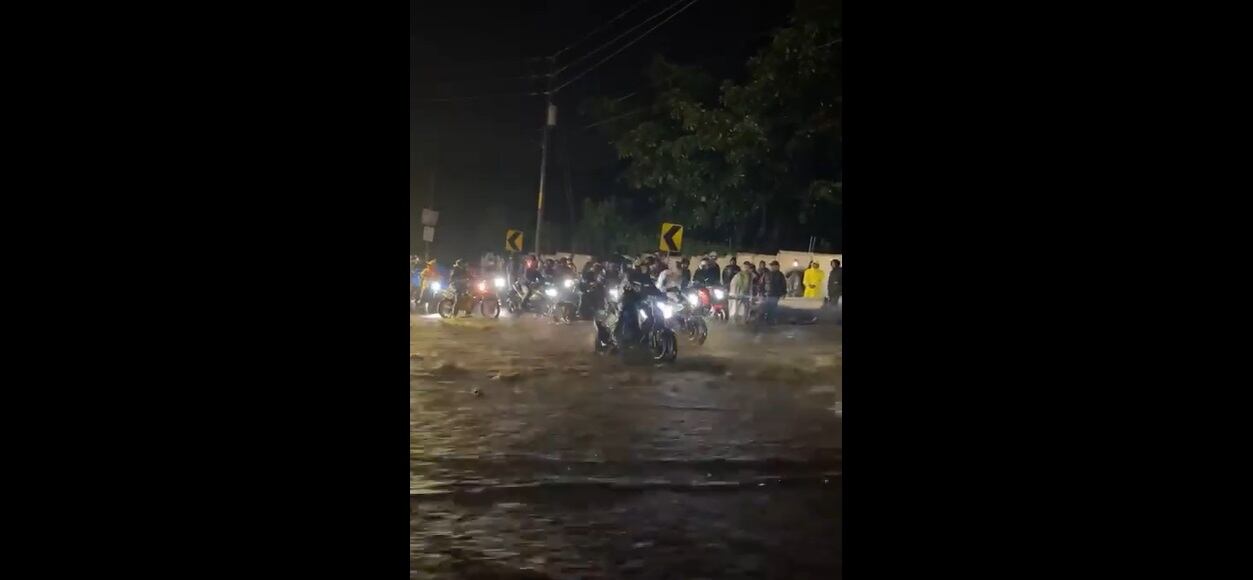 Medios de comunicación locales han compartido en las últimas horas videos en los que se observa una correntada de agua que impide el paso fluido de vehículos, con mayor riesgo para pilotos de motocicletas.