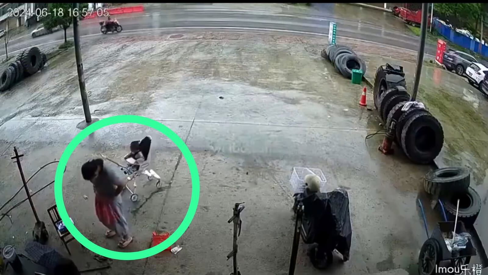 Las imágenes muestran a la madre en las afueras de una tienda de ropa, por unos segundos el pequeño permanece a su lado. De un instante a otro, el carruaje rueda hasta la carretera, incluso este toma impulso debido a la pequeña inclinación del espacio.