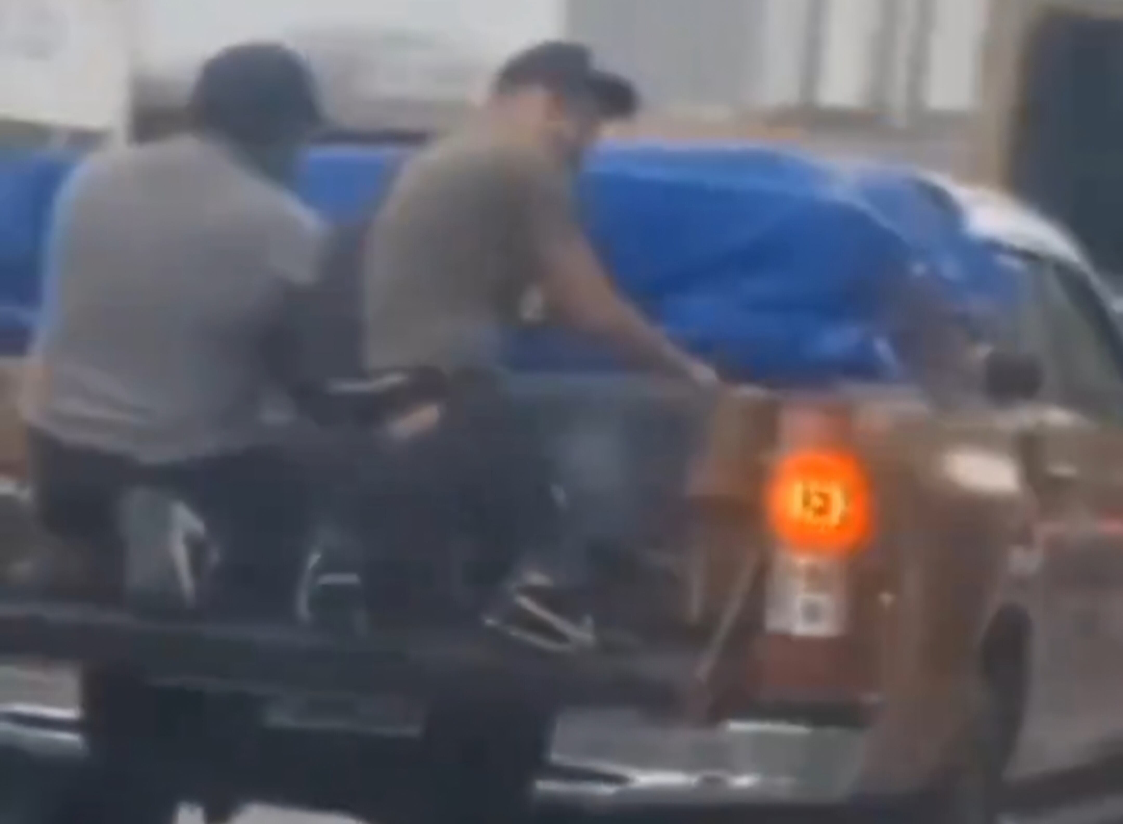 Las imágenes muestran a los dos sujetos acuclillados en la palangana del vehículo, este tiene asegurada la mercadería con un nylon y con un lazo para evitar que se mueva durante el trayecto.
