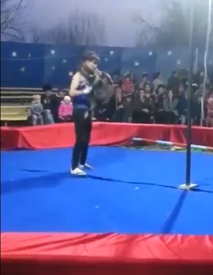 Luego de que pasaran varios segundos, llegan los otros encargados del show y de manera brusca jalan al hombre, le desenrollan la serpiente y se lo llevan arrastrado de una mano.