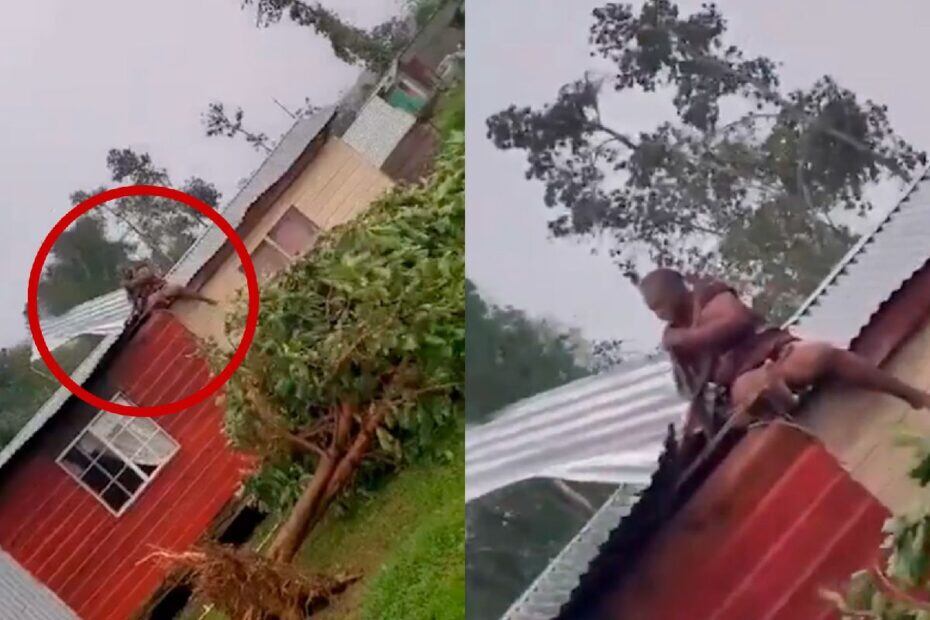 En las imágenes se puede observar cómo la mujer se aferra al techo de lámina del que podría ser su hogar para no salir volando y para que tampoco su casa se destruyera.