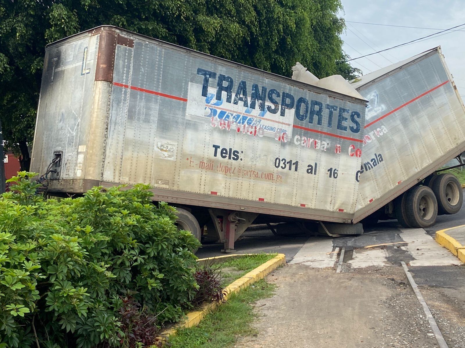 En la octava avenida y calzada La Paz zona 17 se reportó un extraño accidente, un tráiler que transportaba un furgón con 500 quintales de abono se partió a la mitad. Ante ello, el paso vehicular en dirección a zona 18 se encuentra cerrado en lo que es removido el transporte pesado.