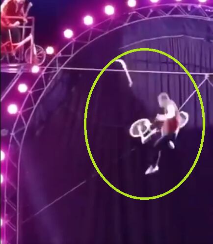El acróbata consiguió avanzar unos centímetros, pero a punto de llegar al final de la cuerda floja, la bicicleta se fue de reversa, lo que ocasionó que él perdiera el equilibrio y cayera.