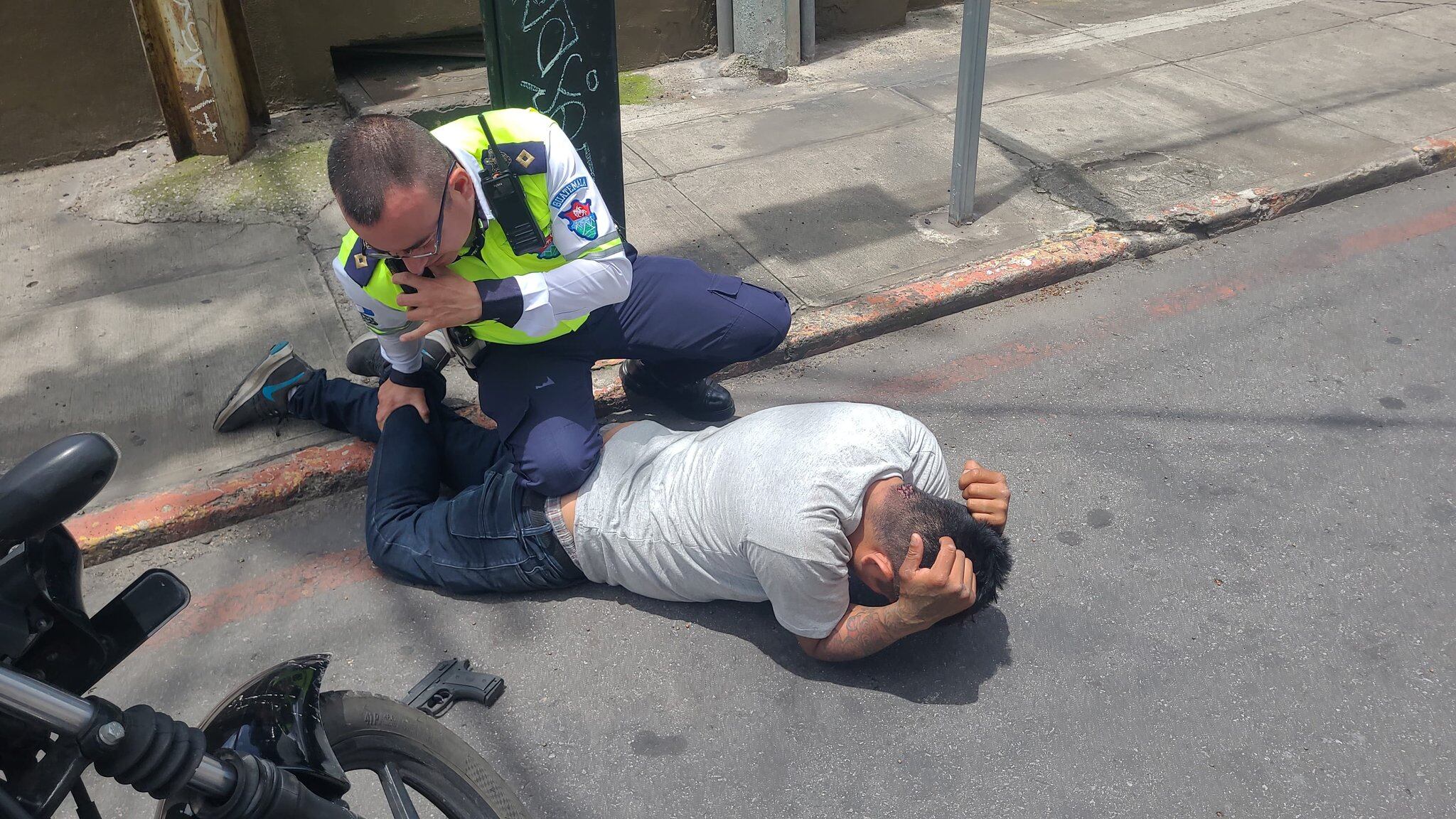 Un policía municipal caminaba por la zona 4 de la ciudad de Guatemala cuando notó a un hombre que amenazaba a varios automovilistas y les exigía los celulares. Testigos dijeron que el uniformado se acercó y lo pudo retener. Ese momento fue aprovechado por varias personas para ayudar al agente.