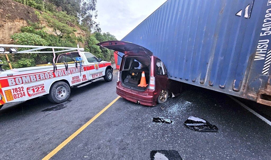 Bomberos Voluntarios de Antigua Guatemala, llegaron al lugar para atender la emergencia y reportaron a una persona fallecida. Se trata del piloto del vehículo liviano que quedó aplastado por el contenedor.