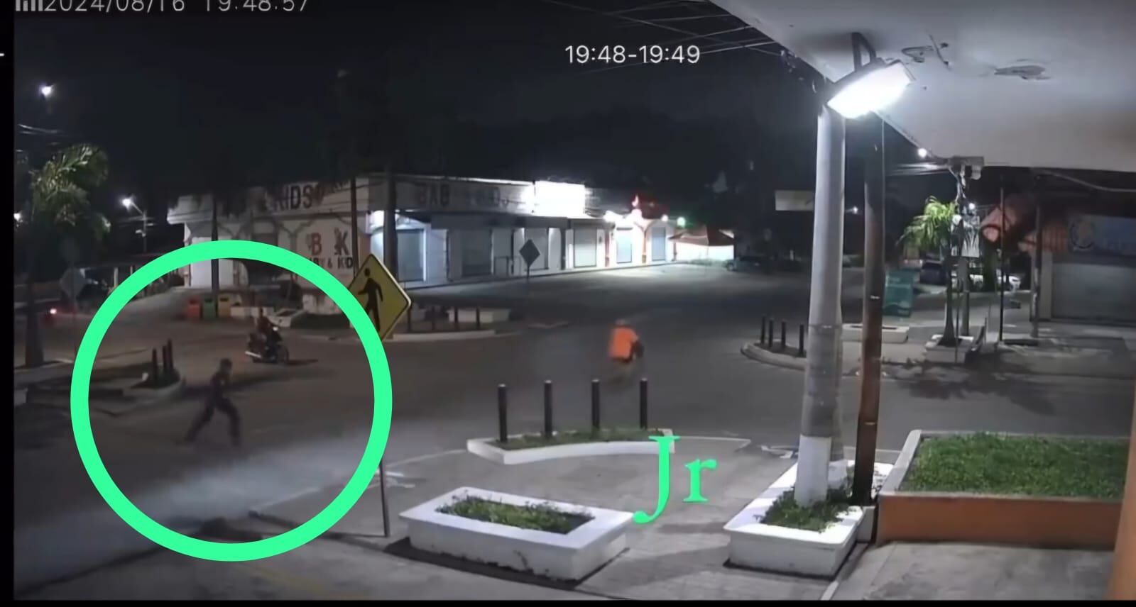 Hasta el momento, se desconoce la identidad de ambas personas. Las imágenes captan a un peatón cruzando una calle, al otro extremo un motorista conduce a toda velocidad.