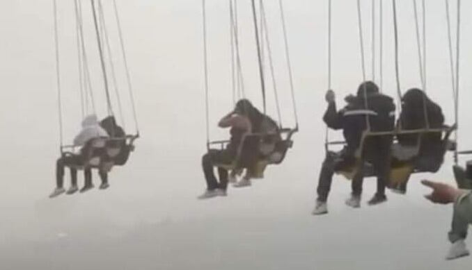 El primer video que se publicó en las redes sociales, solamente muestra la perspectiva de quienes están a pie de calle, mientras que un segundo video mostró la vista desde las alturas. Luego, la atracción comenzó a descender poco a poco, con el objetivo de salvaguardar cada una de las vidas, y se suspendió hasta que la lluvia pasó.
