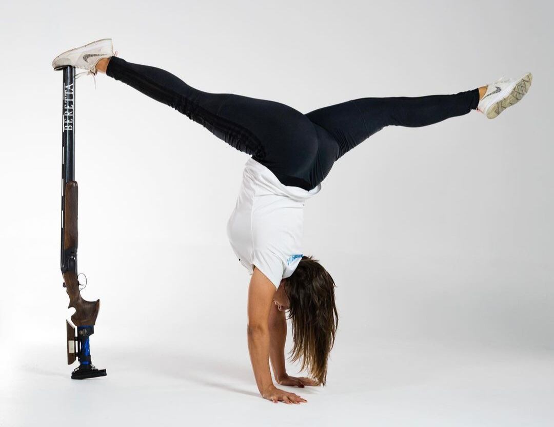 “2 pasiones en 1 foto una lesión de espalda que me obligó a despedirme de mi gran pasión, la gimnasia artística, pero que también fue el camino que me guió a mi nueva pasión, el TIRO”, describió en un post de Facebook.