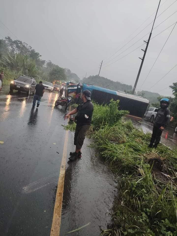 Un autobús que trasladaba a “un puñado” de pasajeros desde San Miguel Pochuta, Chimaltenango, hacia la ciudad de Guatemala volcó en el kilómetro 98 de la ruta al Pacífico. Los pocos pasajeros que resultaron heridos fueron auxiliados por automovilistas.