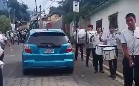 En redes sociales circula un video en donde un conductor con poca paciencia irrumpe con su vehículo en medio de un desfile de bandas que recorría una calle de Cantel, Quetzaltenango.