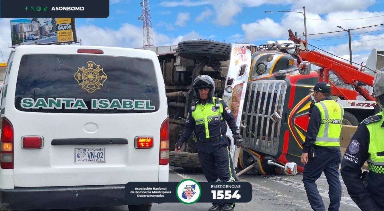 El transporte de la unidad ESMERALDA por causas desconocidas termina volcado sobre la cinta asfáltica dejando varios heridos y personas con crisis nerviosa, Bomberos de Bárcenas le brindan primeros auxilios a dos señoras heridass. Las victímas fueron trasladadas al Hospital de Villa Nueva, por otro lado Bomberos Voluntarios realizaron el traslado de siete personas más al Hospital de Amatitlán.