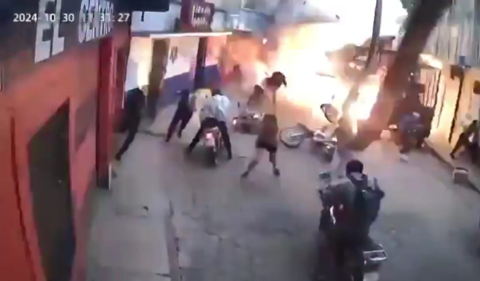 En el video de cámaras de seguridad se observa que transeúntes y motoristas pasan cerca del comercio cuando se registra una explosión.
