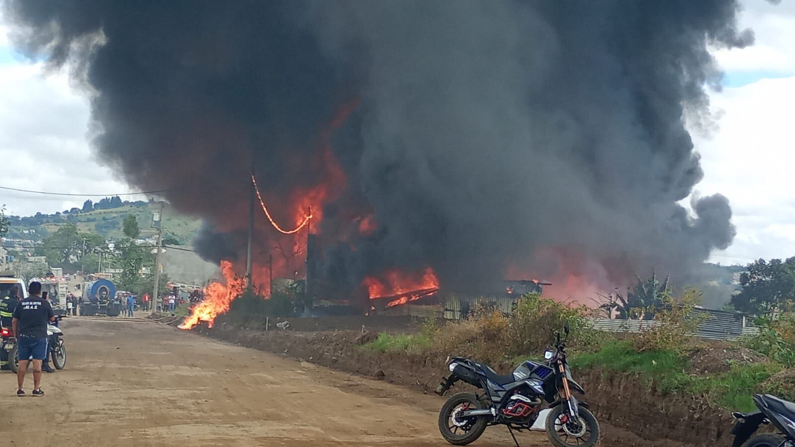 Bomberos Municipales Departamentales y Bomberos Voluntarios trabajan en para sofocar un incendio de grandes proporciones que se registra en una recicladora, ubicada en la colonia Ulises Rojas, Bárcenas, Villa Nueva.