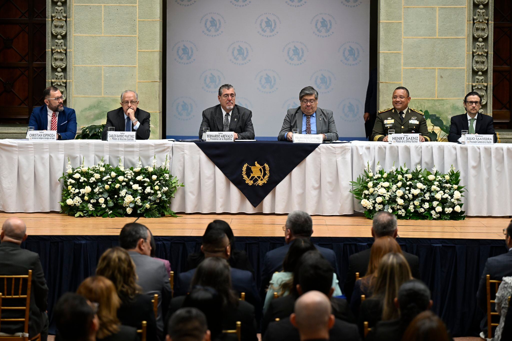 “Uno de los principales desafíos nuestros como Gobierno es garantizar la seguridad de todos los guatemaltecos”, dijo el gobernante en el Palacio Nacional de la Cultura ante los funcionarios que tienen a su cargo la seguridad en el país, así como invitados.