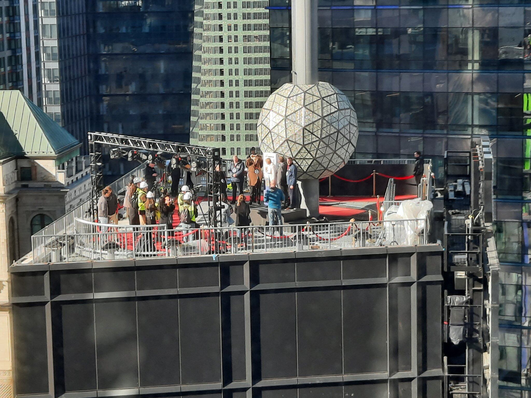 Durante las pruebas participaron Pitbull y Joy Mangano quienes ayudaron a colocar los últimos cristales de la bola que mide 336 centímetros de diámetro, pesa 5.4 toneladas y es adornada con triángulos de Gillinder Glass.