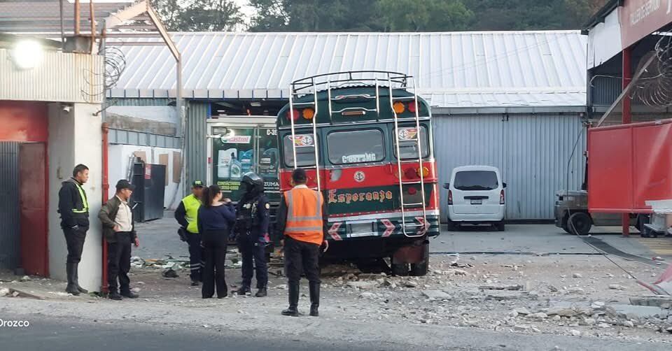 Un autobús queda empotrado en el portón de ingreso a una empresa ubicada en el Km. 26 ruta hacia el Pacífico.
