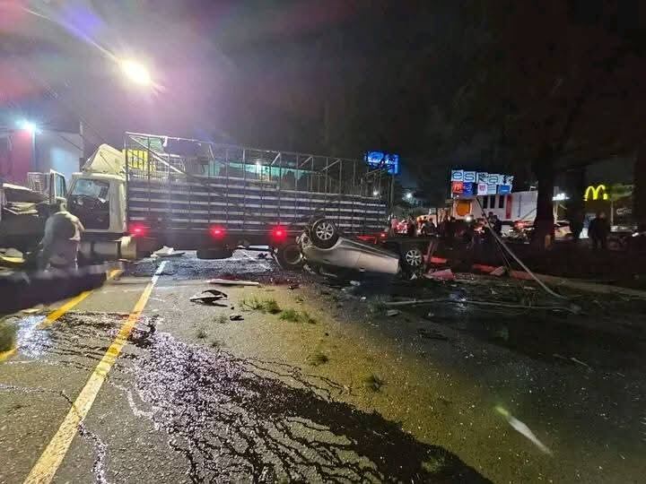 A esta hora de la noche se reporta un aparatoso accidente de tránsito frente al Centro Comercial Eskala Roosevelt, según la versión preliminar un vehículo de transporte pesado se dirigía de la ciudad capital hacia Mixco cuando por razones que se desconocen se pasó a la vía contraria e impactó con dos vehículos livianos.