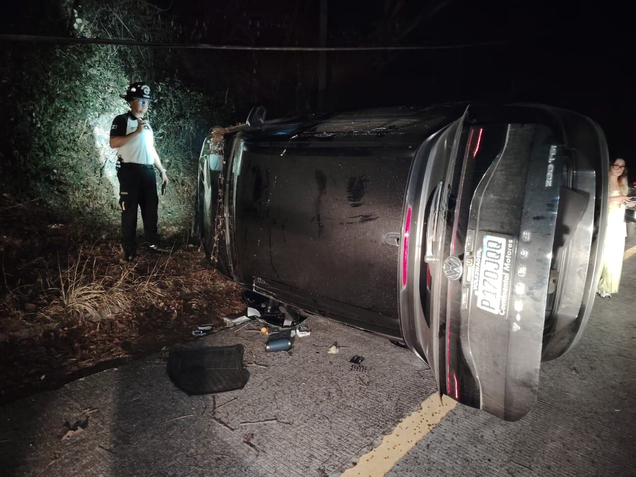 En horas de la madrugada del sábado 15 de marzo se reportó un accidente de tránsito donde un vehículo particular derribó un poste del tendido eléctrico, y quedó volcado en la cinta asfáltica en el kilómetro 36, de la Ruta Nacional 10, con dirección a Santa Lucía Milpas Altas, Sacatepéquez.