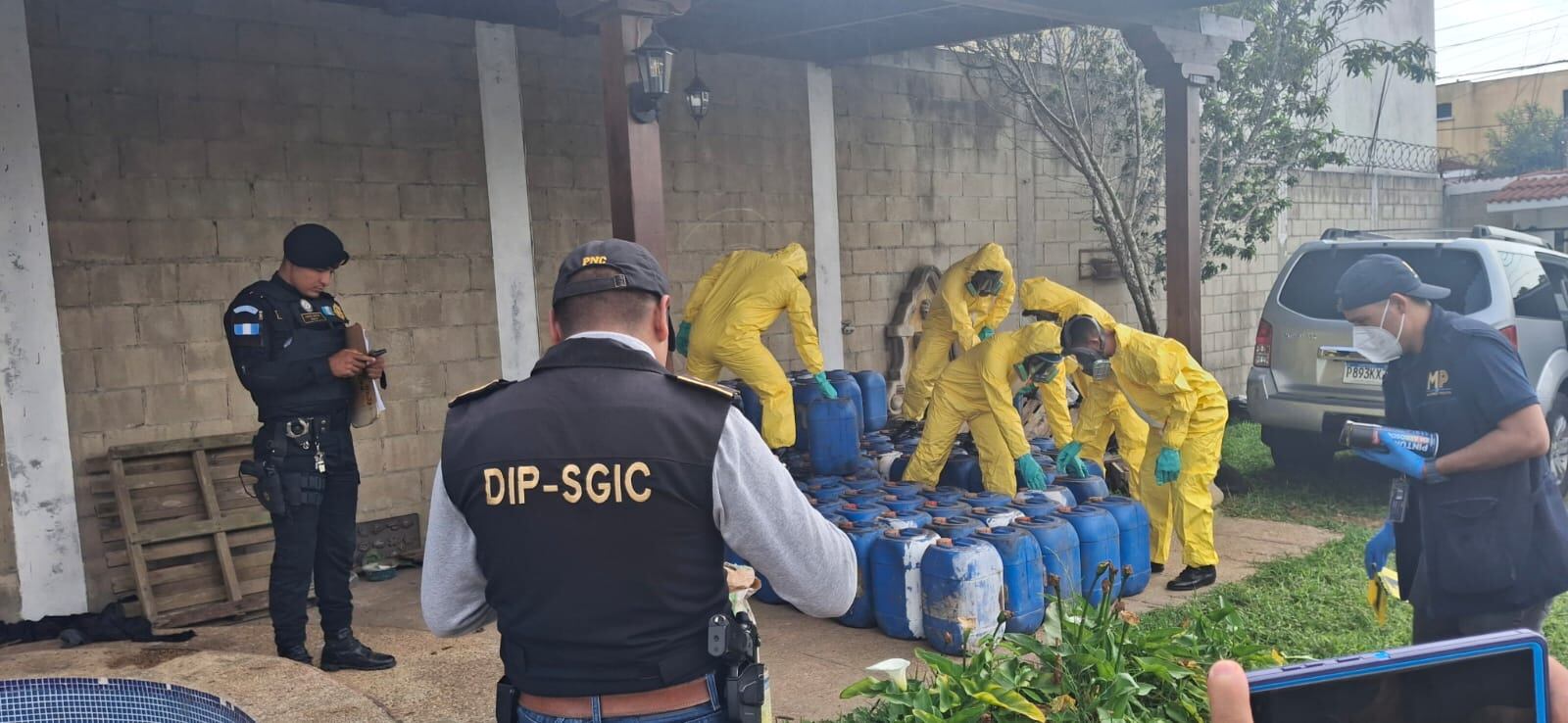 En un operativo coordinado entre agentes de la División de Información Policial (DIP), el Grupo de Acción Rápida (GAR), el Grupo Especial contra la Criminalidad Organizada (GECE) y fiscales del Ministerio Público (MP), se realizó un allanamiento que culminó con la localización de diversos insumos utilizados para la elaboración de drogas, además de la detención preventiva de cuatro hombres, uno de ellos de nacionalidad mexicana.