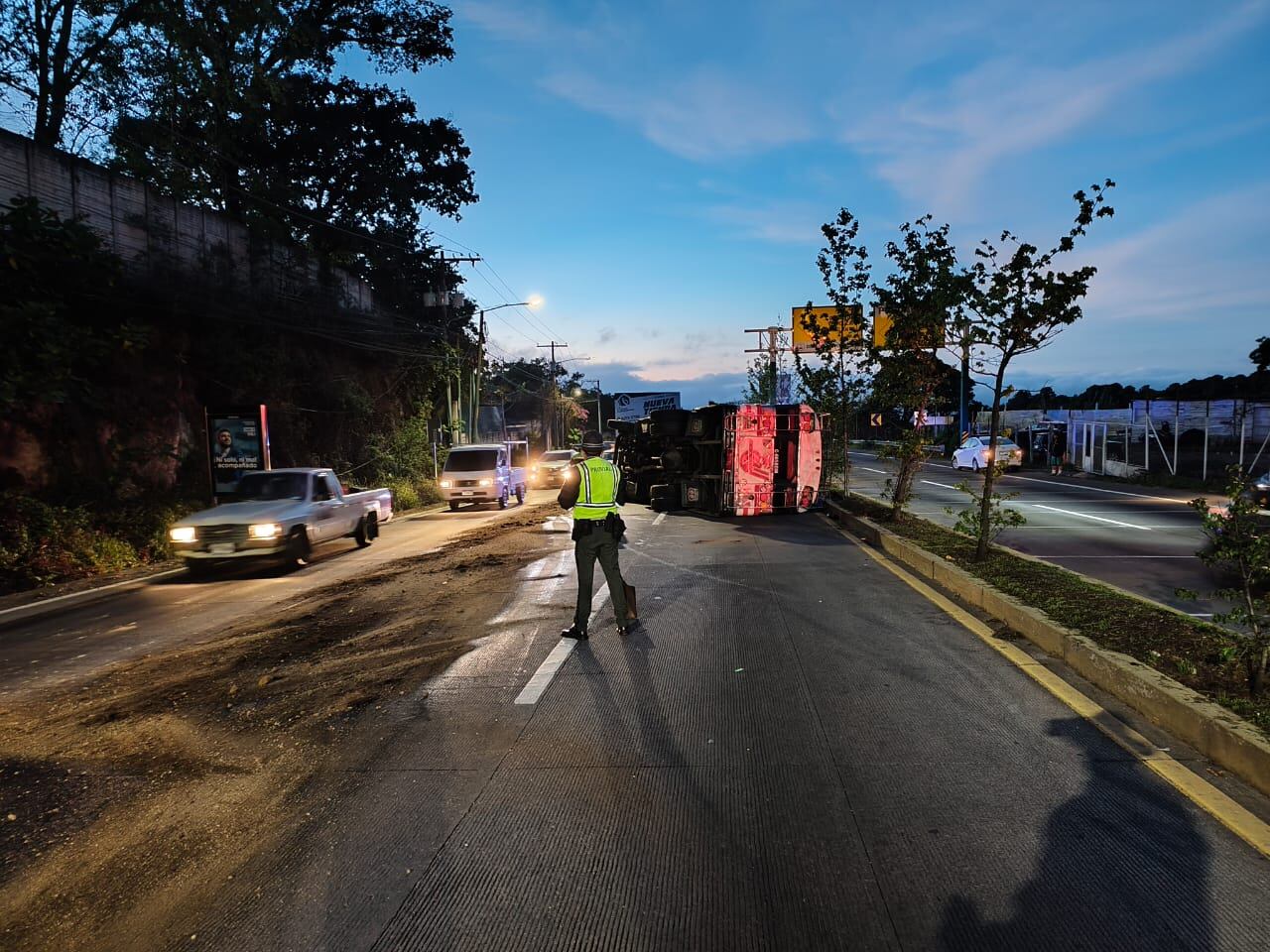 En horas de la madrugada de este domingo, en el kilómetro 19 de la ruta Interamericana, un bus extraurbano que había salido de la 19 calle de la zona 1 con destino a San Marcos volcó de forma aparatosa sobre la cinta asfáltica. El accidente ha provocado congestión vehicular en ese punto.