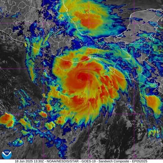 Según el Instituto de Sismología, Vulcanología, Meteorología e Hidrología (Insivumeh), el huracán Erick se desplaza a una velocidad aproximada de 14 kilómetros por hora con dirección noroeste y se aleja cada vez más del territorio nacional.