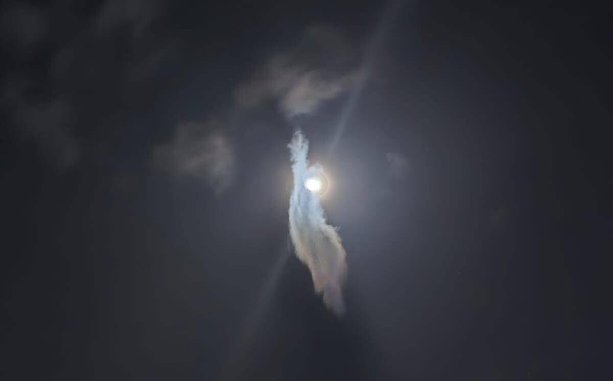 La fotografía tomada por un ciudadano muestra con claridad cómo una nube delgada parece “envolver” la luna, mientras un rayo de luz se extiende hacia arriba, creando una figura que muchos compararon con una silueta angelical o una columna de energía.