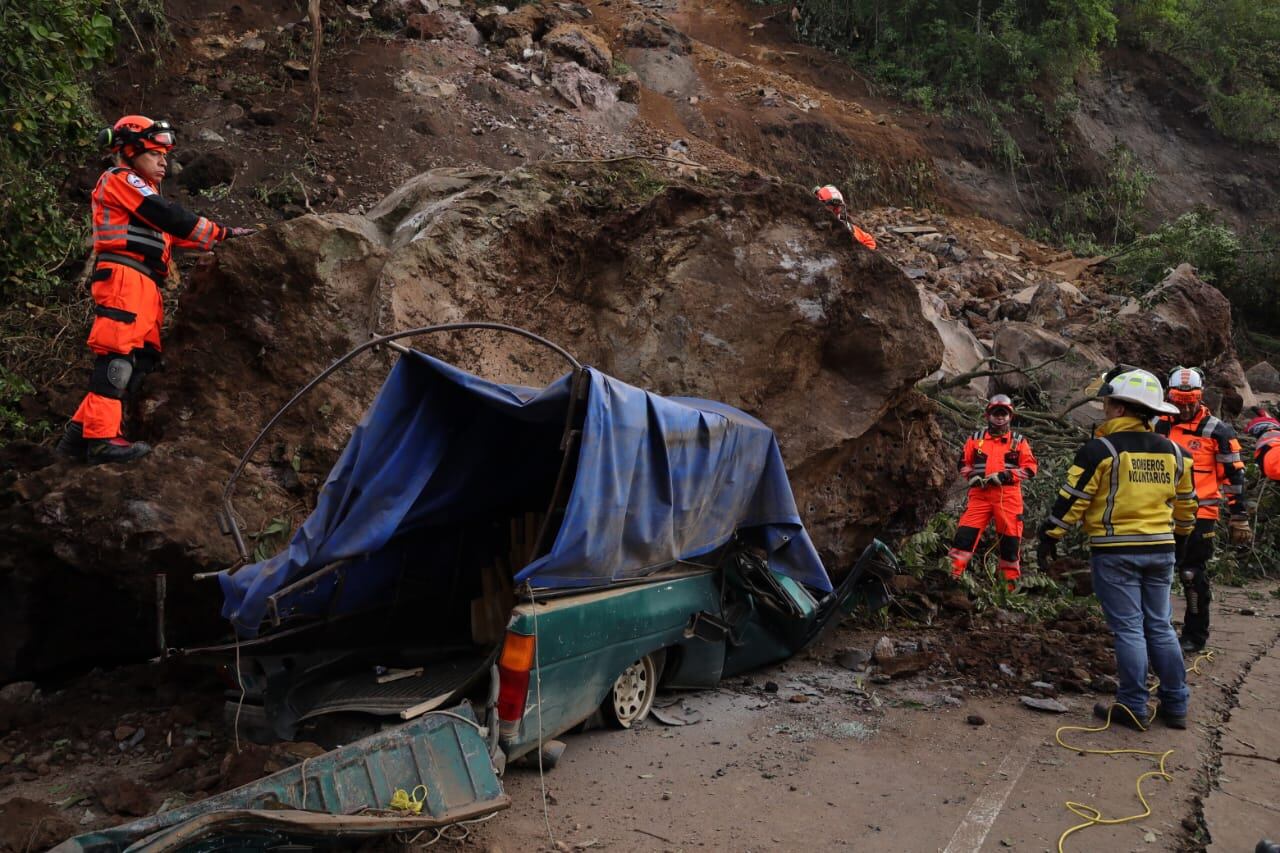 Arévalo actualizó la cantidad de fallecidos, heridos, afectados y albergados. El comerciante Teodoro Chill, de 53 años, y su hijo Federico, de 20, murieron cuando una enorme roca aplastó el picop donde viajaban en el kilómetro 47 en la carretera de Palín hacia Santa María de Jesús y sus cuerpos fueron extraídos por los Bomberos Voluntarios. La señora Regina López Velásquez, de 44 años, quedó soterrada junto con su perro “Spike” en la aldea El Tablón, en la zona 3 de Villa Nueva. También una persona soterrada en la aldea Santa Inés, en Antigua Guatemala y un adolescente fallecido a causa de un deslizamiento en El Basurero, Santa María de Jesús, Sacatepéquez.