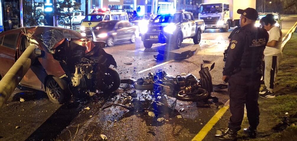 Un fuerte accidente de tránsito se registró la madrugada de este lunes 14 de julio en el bulevar Liberación y 5a avenida de la zona 9 capitalina, el cual involucró una moto y un vehículo particular.