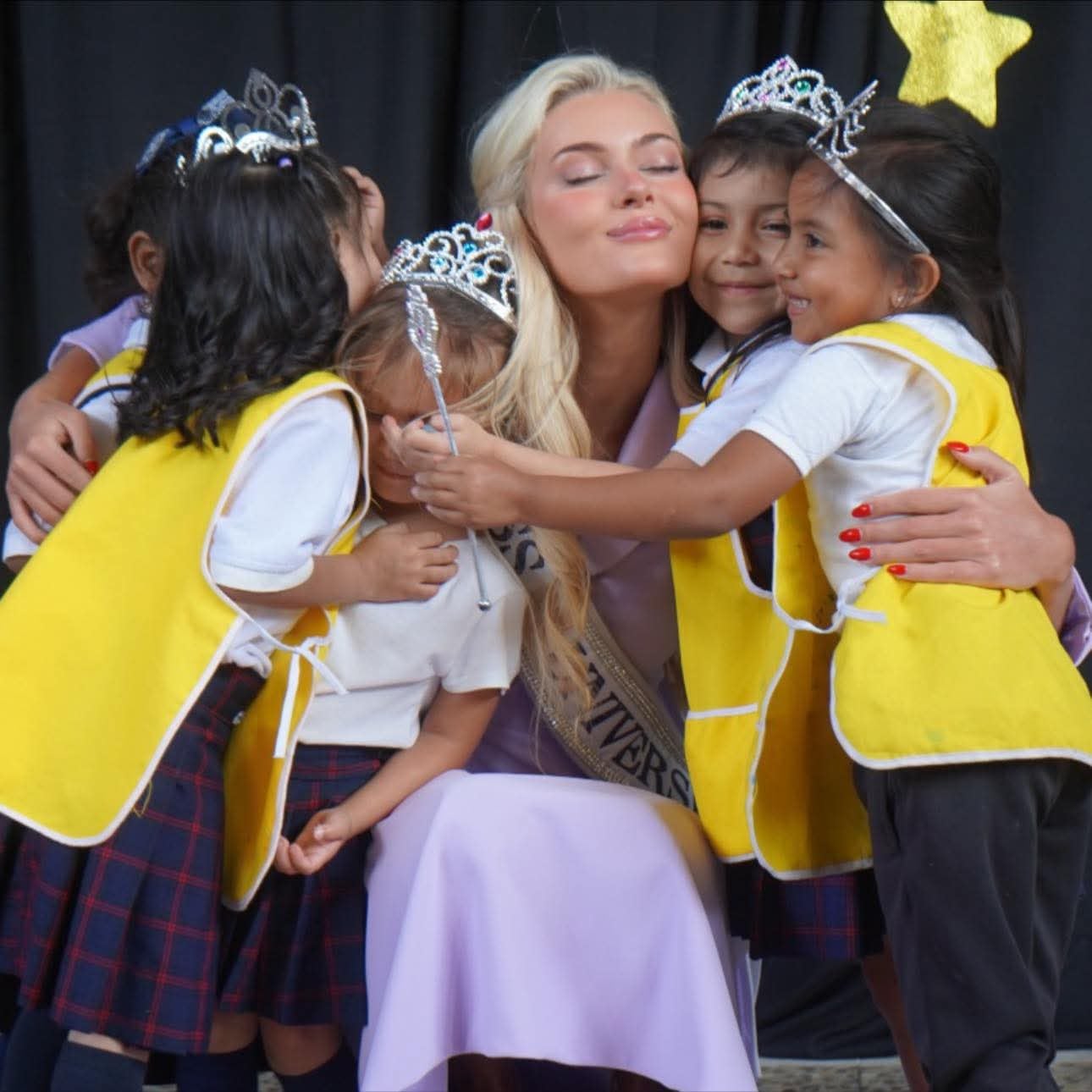 Además, llevaban puestas coronas, para ellas fue un sueño hecho realidad conocer y compartir con Miss Universo, quien agradeció los gestos con abrazos y sonrisas.