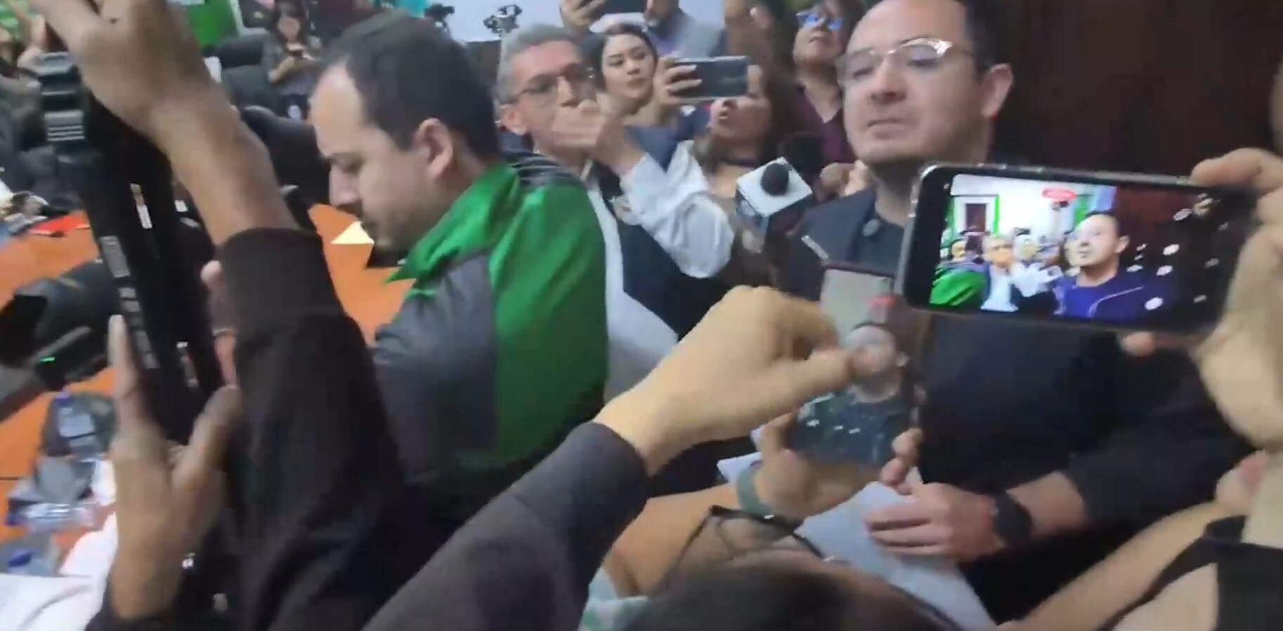 Los diputados Samuel Pérez, Elena Motta y David Illescas irrumpieron en el salón utilizado para la citación por diputados de la UNE y entregaron una copia de lo que denominaron “querella”, el cual intentaron entregar a Acevedo, lo que desató la reacción del sindicalista, quien los acusó de hacer un “show político” y los tildó de “corruptos”.