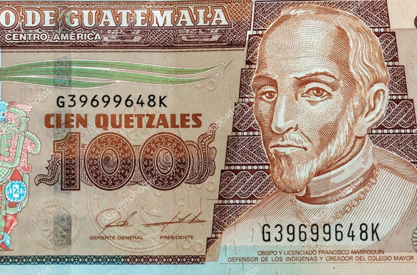 Otro detalle distintivo de esta nueva emisión es la marca de agua, que presenta el rostro de Francisco Marroquín —primer obispo de Guatemala— y el número 100, que también funciona como elemento de verificación al trasluz.