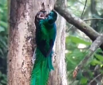 En video quedó captado el momento en que un papá y una mamá quetzal alimentaron su cría.